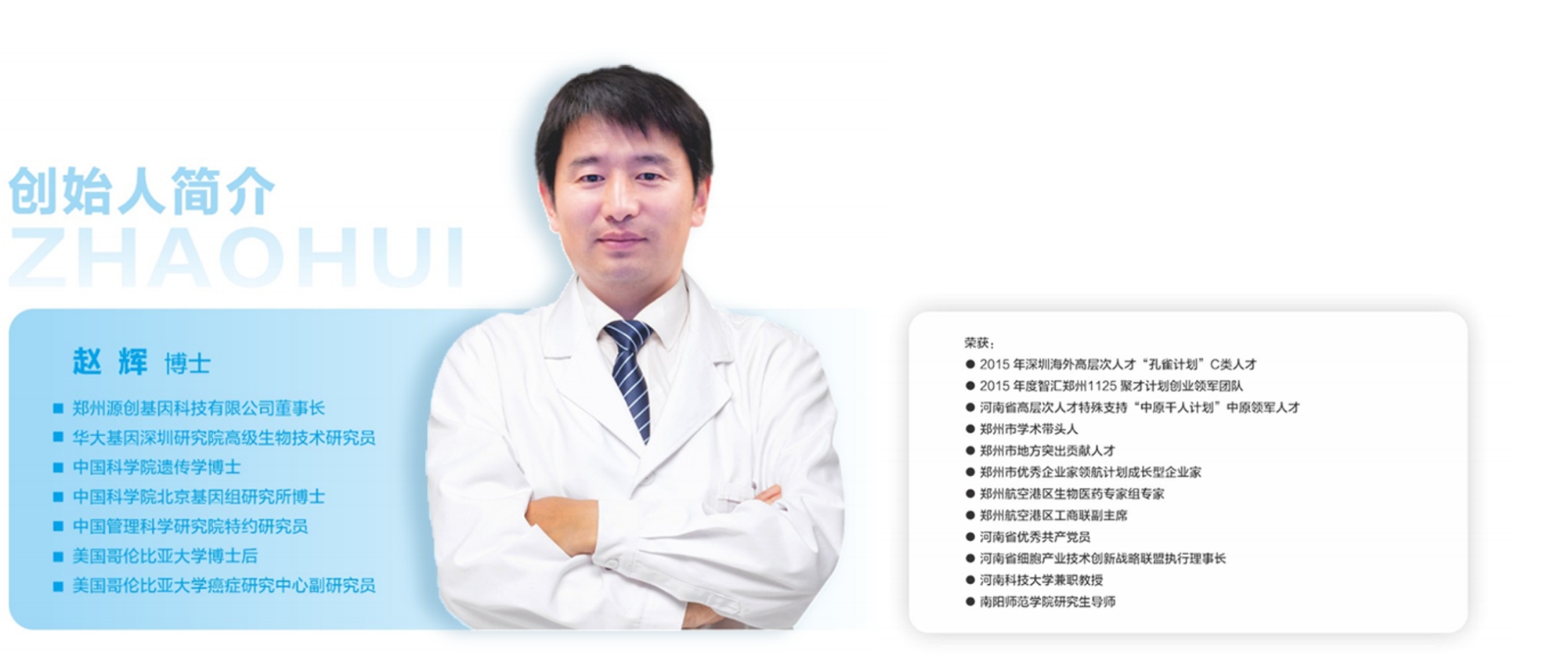 鄭州源創(chuàng)基因科技有限公司成立于2016年,由哥倫比亞大學博士后趙輝,歸國創(chuàng)辦的國家高新技術(shù)企業(yè)。擁有97項知識產(chǎn)權(quán)及實用技術(shù),業(yè)務遍布上海、重慶、深圳、北京等城市,總部在鄭州航空港區(qū)。